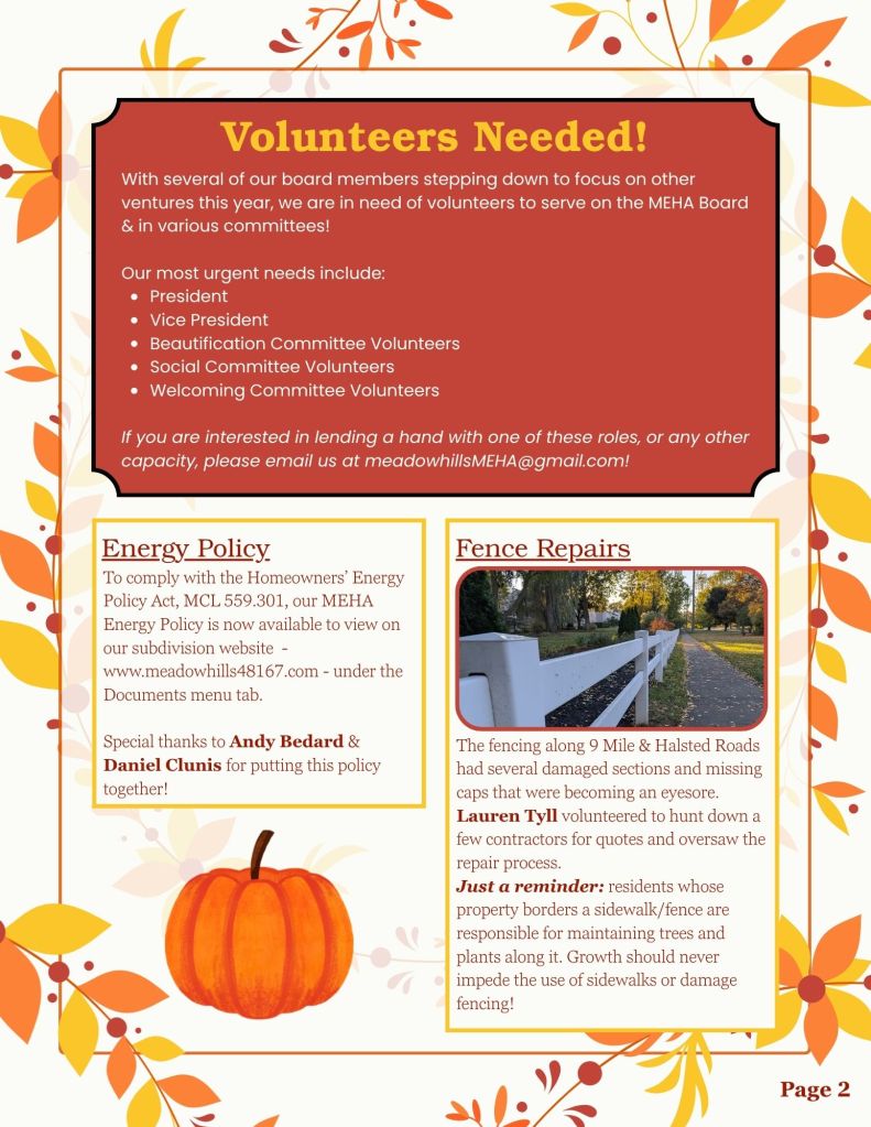 If you are willing and able to volunteer some of your time over the coming year in any capacity – big or small – please reach out to mehasecretary48167@gmail.com to talk about the different opportunities available! Every volunteer really helps, whether it’s a recurring role, like Vice President or Secretary, or helping with a single event throughout the year, like the end of year ice cream truck or Spring cleanup of the front entrances. Generally, the time commitment for board members is low, and it’s a great way to meet your neighbors and get involved in your community!